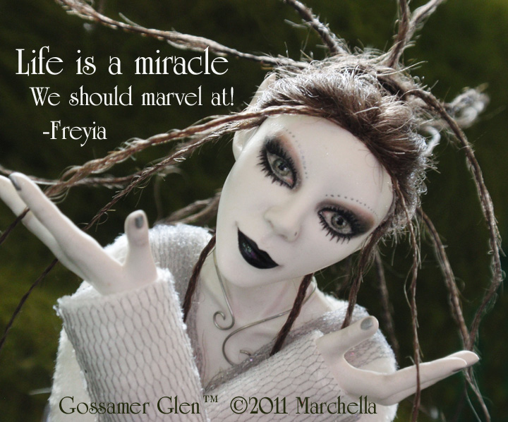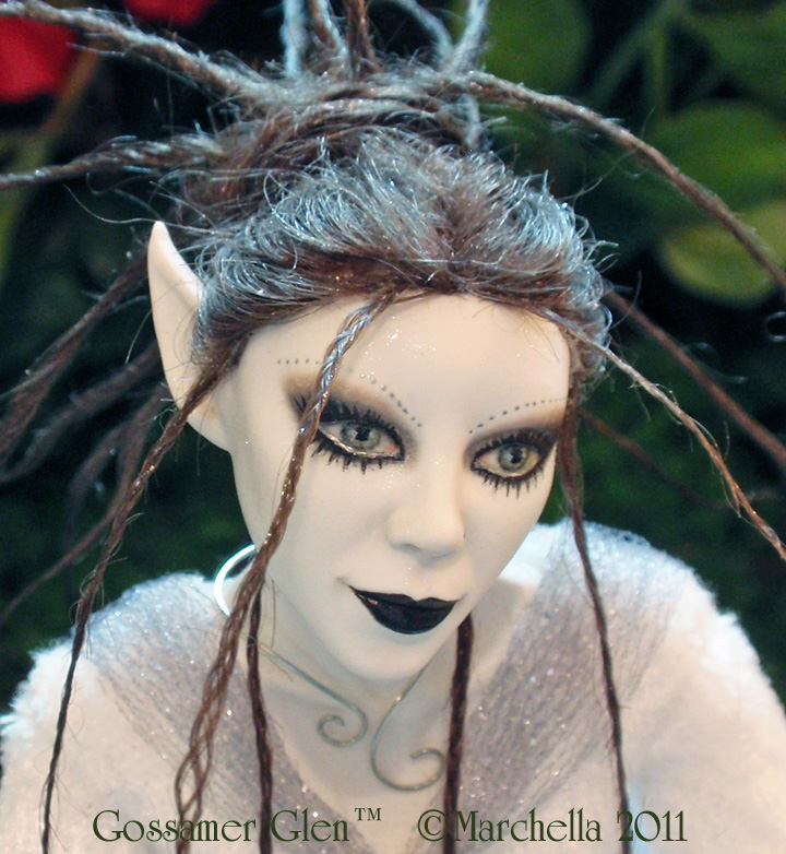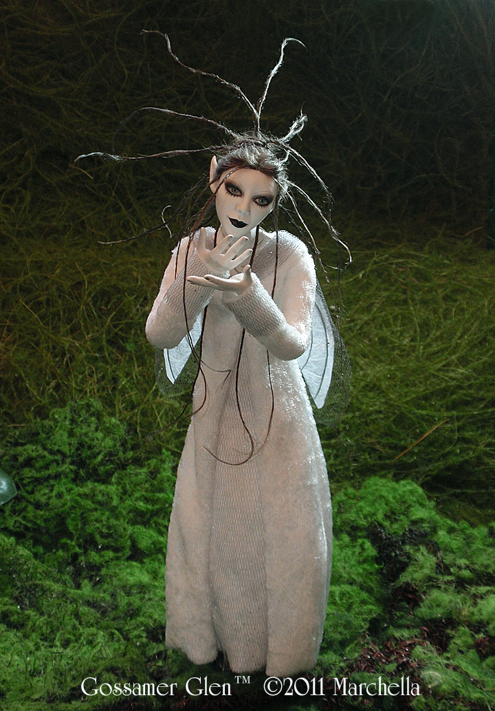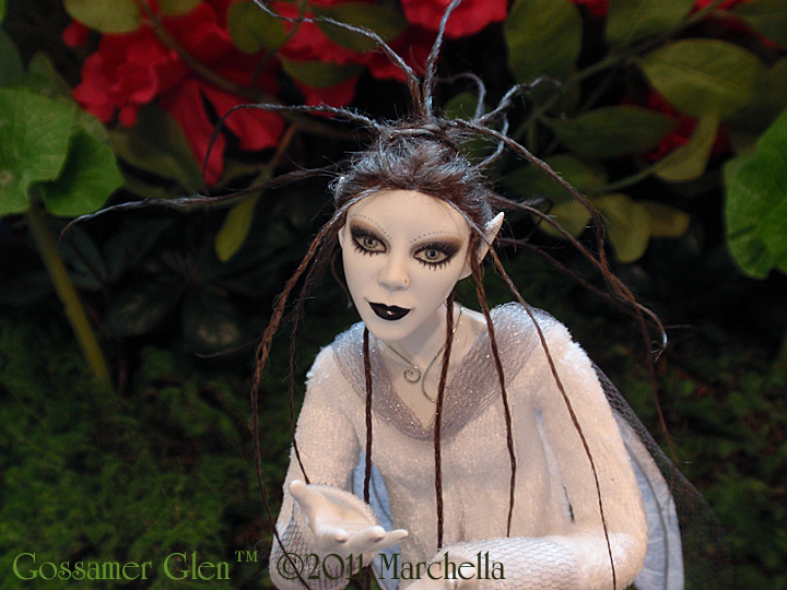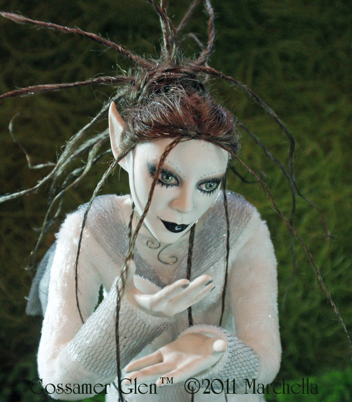 "Freyia" Faerie is another original, one of a kind faerie creation from Gossamer Glen™, created by internationally renowned fantasy artist Marchella. She measures about 7" (17.5 cm) in height, not including hair. The Faeries of Gossamer Glen are exquisitely detailed and unique in their designs. And distinctly different in their appearance. One of their many defining characteristics is that they have only three fingers. That, along with their unique shimmering skin tones, pointed toes and expressively large eyes, gives them a look all their own. Enchanting, magical and other worldly. These are the fantastical Faeries of Gossamer Glen.