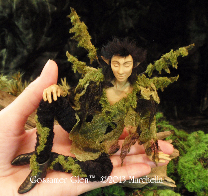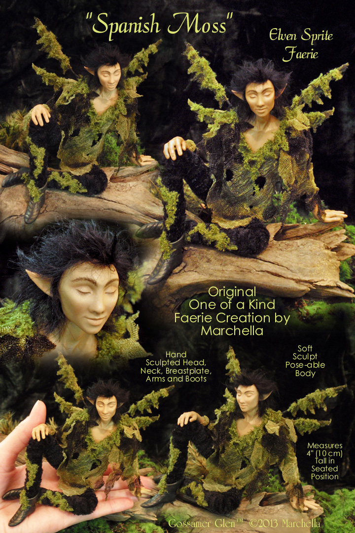 "Spanish Moss" Elven Sprite Faerie is another original, one of a kind faerie creation from the new Gossamer Glen™ Sprite Faeries Collection, created by internationally renowned fantasy artist Marchella. Sprite Faeries, like our Light Faeries, are half the size, half the calories, half the price, with all of the flavor of our Inspiration Faeries! Elven faeries run a bit taller to be in scale with the female Light and Sprite Faeries.